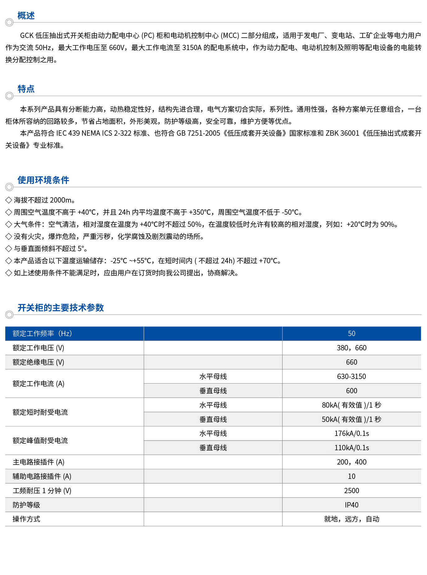 GCK低压抽出式开关柜由动力配电中心(PC)柜和电动机控制中心(MCC)二部分组成,适用于发电厂、变电站、工矿企业等电力用户作为交流50Hz,工作电压至660V,工作电流至3150A的配电系统中,作为动力配电、电动机控制及照明等配电设备的电能转换分配控制之用。